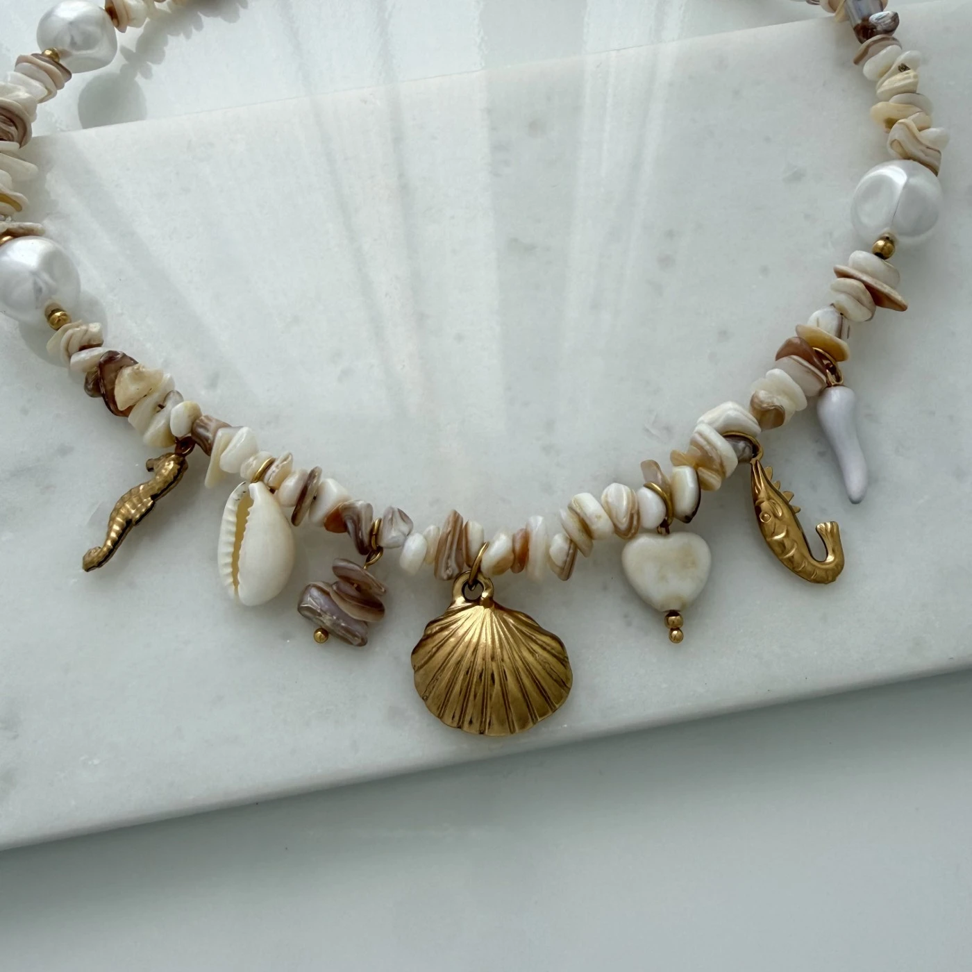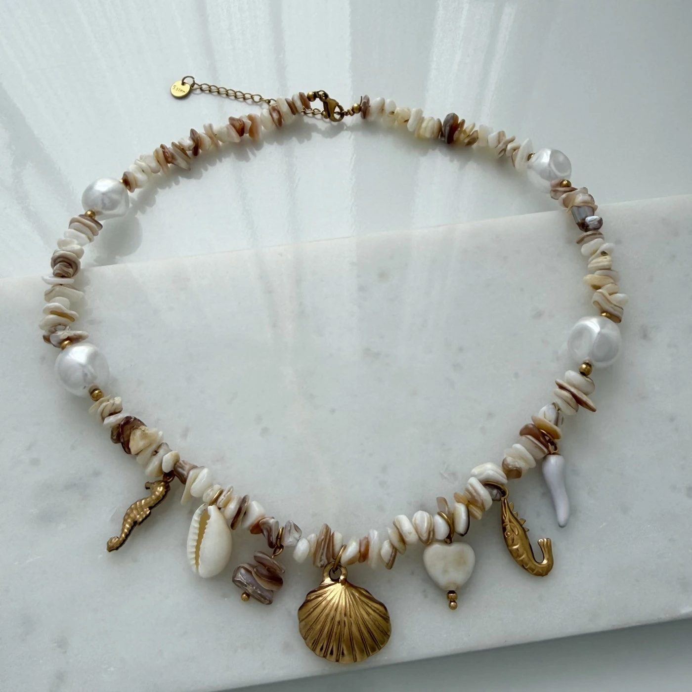 Bej Doğal Taşlı Deniz Figürlü Çelik Kolye Gold