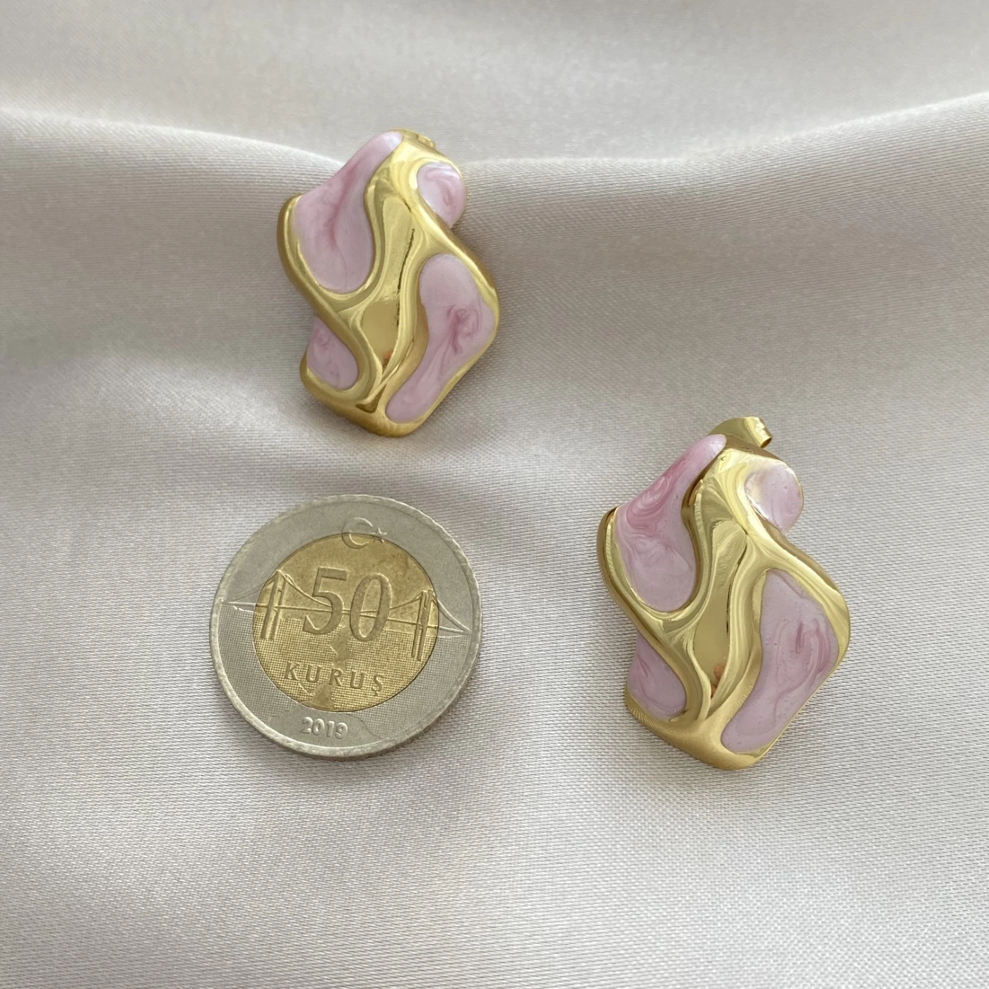 Pembe Mineli Çelik Kıvrımlı Küpe Gold