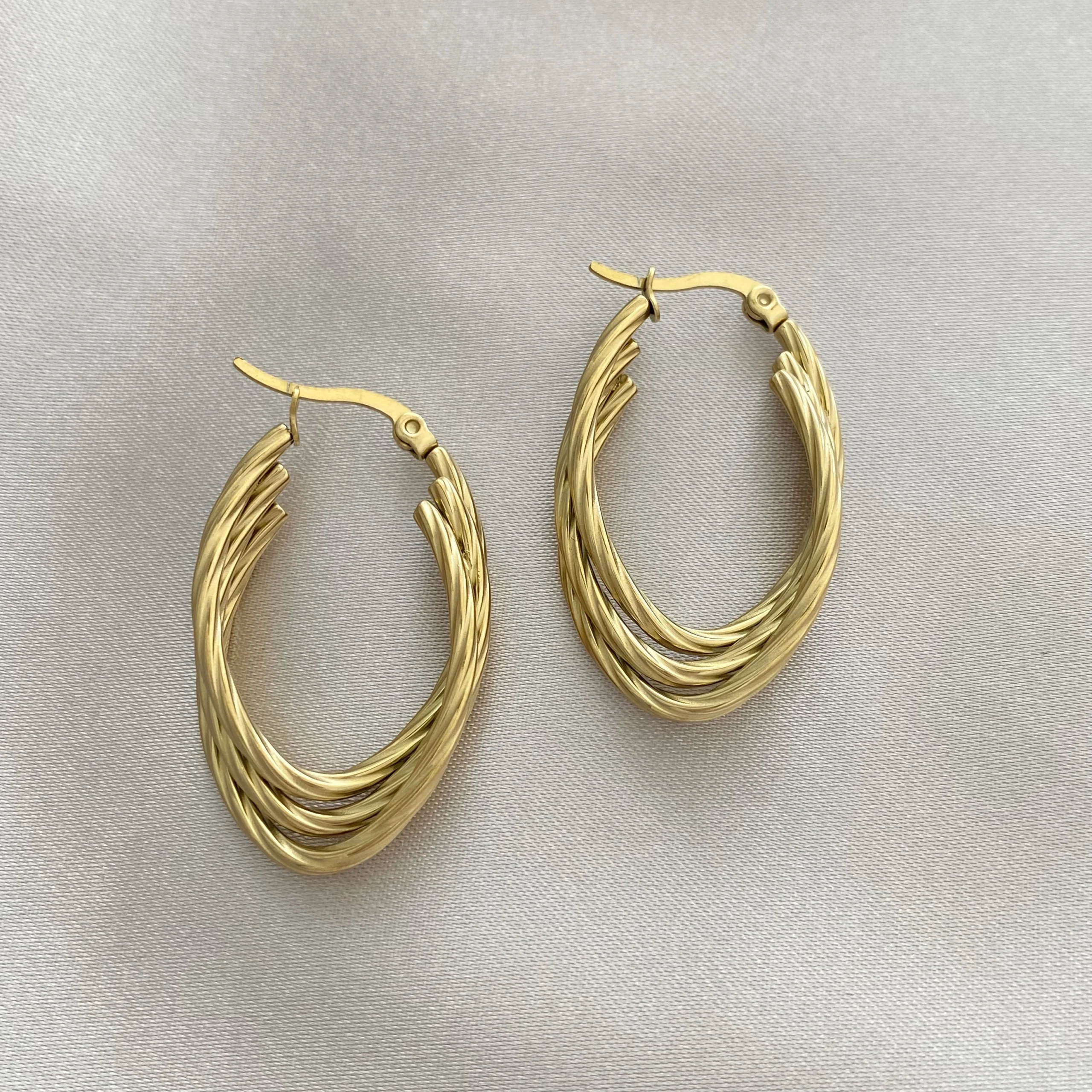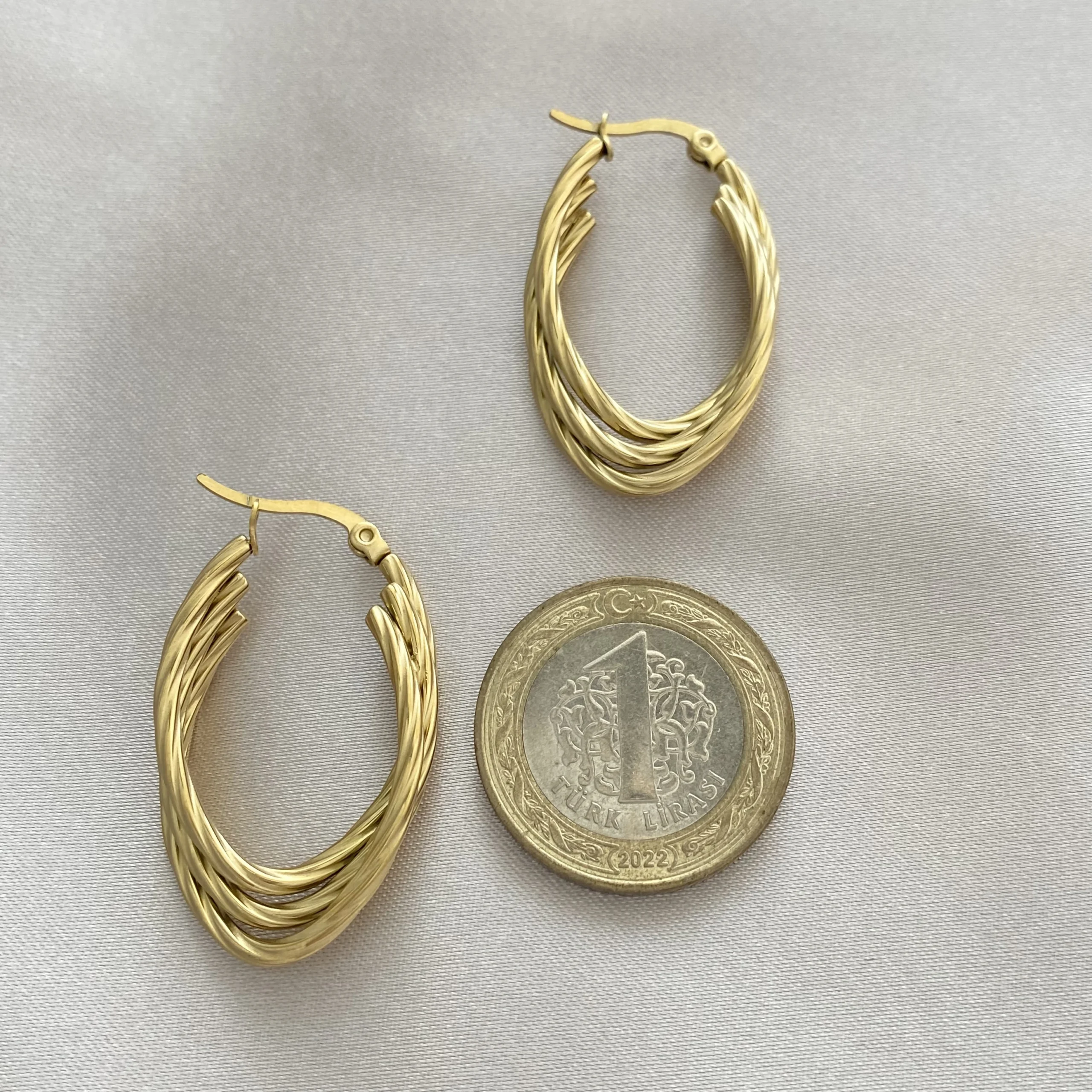 Tırtıklı Oval Halka Çelik Küpe Gold